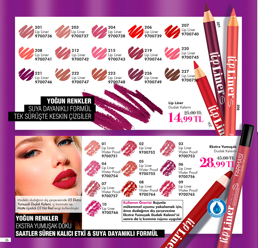 Farmasi Lip Liner Dudak Kalemi içerdiği yoğun renk pigmentleri sayesinde suya dayanıklı şekilde formüle edilmiştir. Ayrıca kullanım esnasında kalitesiz ve inatçı dudak kalemleri gibi dudaklarınızı tahriş etmez. Yumuşak dokusu sayesinde sürümü ve kullanımı çok kolaydır. Uzun süren kalıcı özelliklerdedir. Yanı sıra tek sürüşte dudaklarınızda keskin çizgiler elde edebilirsiniz. Farmasi Kasım kataloğu nda yer alan bu ürünü indirimli fiyatıyla değerlendirmelisiniz. Ayrıca tüm Farmasi ürünlerine %30 ila 40 indirimli sahip olmak için hemen yan tarafta buunan Farmasi üyelik formu nu doldurmalısınız.