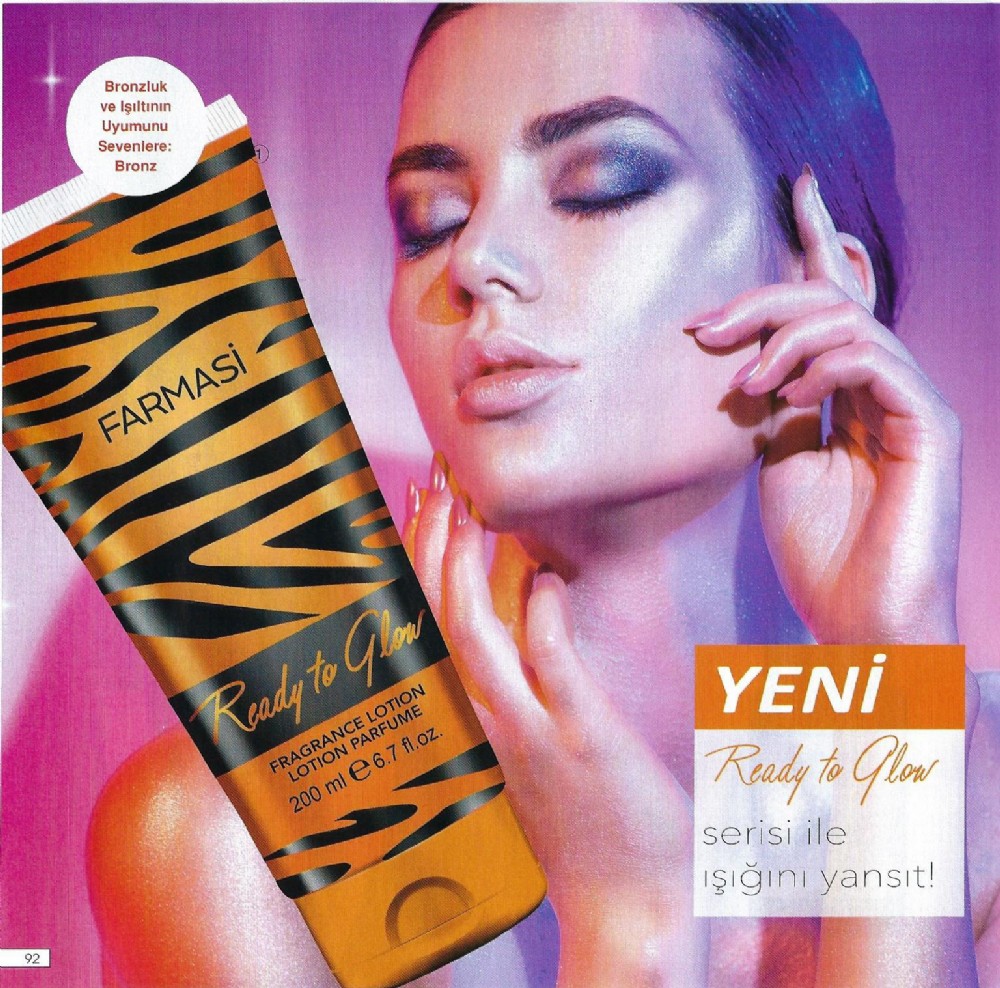 Bronz, altın, gümüş renk seçenekleriyle; porselen beyazlığında, sarı ya da pembe cilt altı tonunuza uygun veya buğday ve esmer tene uygun ışıltıları dilediğiniz tonda seçebilirsiniz. Hafif yapılı bu losyonlar büyüleyici meyve ve çiçek kokularıyla da harmanlanmış. Toplamda üç farklı renk seçeneği sunan Farmasi Ready To Glow Işıltılı Vücut Losyonu ; bronz, altın ve gümüş renklerinde her tüp cilt tonuna uyumlu şekilde tasarlanmış.