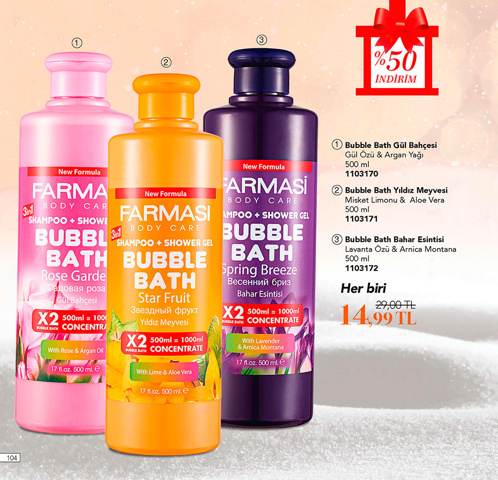 Duş esnasında gerçek bir temizlik hissi ve arınma duygusu yaşamak istiyorsanız, size aradığınız tazeliği Farmasi Buble Bath kazandıracaktır. Duş için 3’ü 1 arada keyfini size sunacak olan bu ürün, şampuan, dilerseniz duş jeli, dilerseniz küvetlerinizde banyo köpüğü olarak size farklı alternatifler sağlayacak olan bir üründür. Konsantre formülüyle 500 ml ambalajında satın alabileceğiniz bu ürün oldukça ekonomik ve bereketli miktarlardadır.