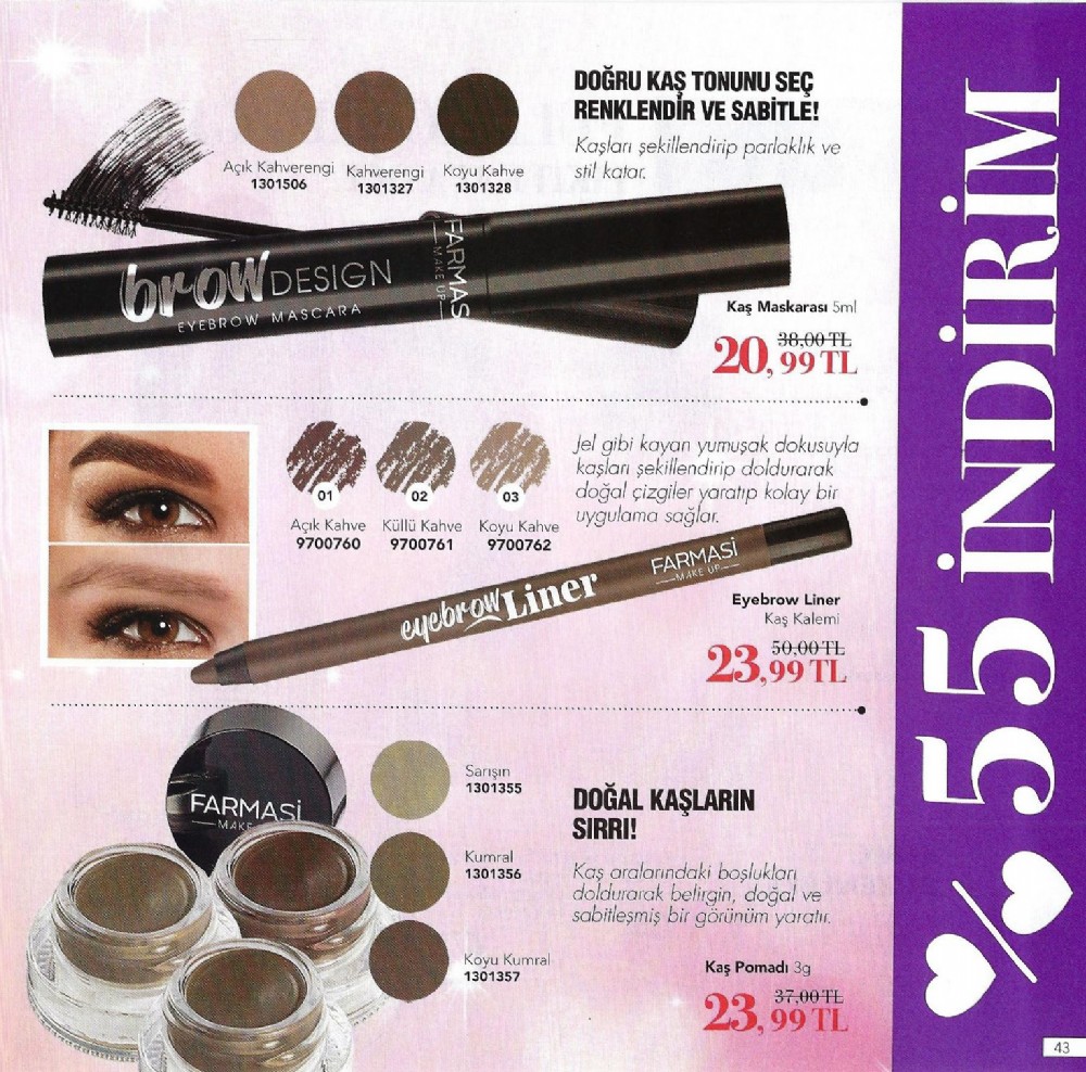 Brow dizayn kaş maskarası ise harika bir ürün… Hacimli kaş maskarası sayesinde kaşlarınızı tarıyor, aralardaki boşlukları dolduruyor ve sabitliyor. Farmasi kaş pomadı ndaysa doğal kaşların gizli sırrı saklı. Parmak uçlarınızla ya da bir aparat ile bile kolaylıkla kaşlarınıza sürerek kaşlarınızı doldurabileceğiniz bu ürünü kullanmak çok basit ve pratik. Ayrıca saniyeler içinde kuruyarak kaşlarınızda sabitleniyor. Hem de 3 ayrı renk tonu mevcut. Tüm Farmasi kaş ürünlerine ve diğerlerine hemen yan tarafta bulunan Farmasi üyelik formunu doldurarak %30 ve 40 indirimli sahip olabilirsiniz.