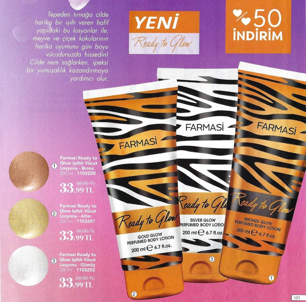 Bu losyon görünümünüze tepeden tırnağa harika bir ışıltı katacaktır. Meyveli ve çiçekli kokusuyla da sizlere kaliteli bir parfümü aratmayacaktır. Teninizde altın, gümüş ya da bronz ışıltılarından hangisini seviyorsanız bu ürünü sürerek saniyeler içinde cildinizde yansıtabilirsiniz. Örneğin siyah elbiseleriniz, antrasit rengi tuvaletlerinizle silver gümüş tonlarını kullanabileceğiniz gibi kırmızı gece elbiselerinizle de altın tonlarını tercih edebilirsiniz. Ya da kahve – toprak rengi kıyafetlerinizle de bronz rengi ready to glow losyonu kullanabilirsiniz. Ayrıca bu ürüne ve tüm diğer Farmasi ürünlerine %30 ila 40 indirimli sahip olmak istiyorsanız Farmasi üyelik formu nu doldurabilirsiniz.