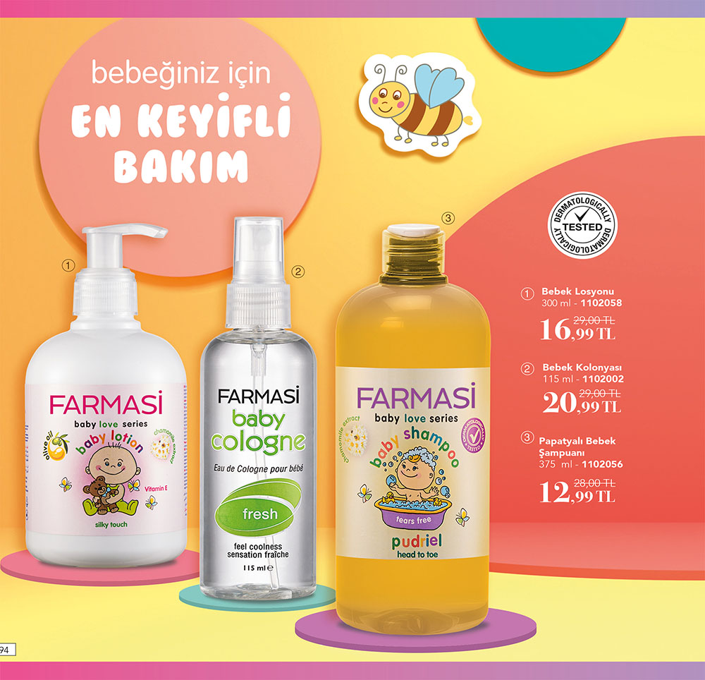 Farmasi Zeytinyağlı Bebek Şampuanı, Farmasi Saç Açıcı Sprey, Farmasi Baby Fresh Bebek Losyonu, Farmasi Pişik Öleyici Krem, Farmasi Papatya Özlü Bebek Şampuanı, Farmasi Zeytinyağı ve Papatya Özlü Bebek Yağı, Farmasi Bebek Kolonyası bunların başlıcaları.