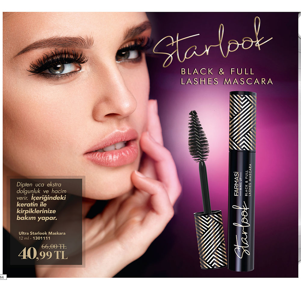 Farmasi Ultra Starlook Maskara; dipten uca kıvrık ve mütemadiyen uzayan kirpikler istiyorsanız, bu ürün tam da size göre. Ekstra dolgun kirpiklerin yaratıcısı bu ürünün özel çam şeklindeki konik fırçası size yuvarlak kıvrımlı kirpikler sağlayacak. Ayrıca keratin bakım garantisi de ürünle birlikte geliyor.